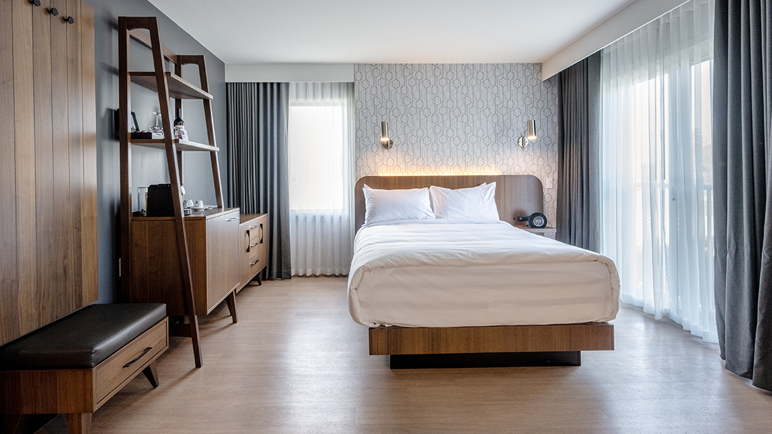 Enjoy the advantages of urban life in the The Rectō – Queen room overlooking the city. Ideal for two people, this spacious room features a queen-size bed. You’ll be handily located for your next excursion. All Rectō rooms have a lounge area and offer the coziness of a fireplace.